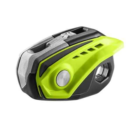 The four-way safety lock allows inserting the rope without having to separate the device from the karabiner. Steel inserts in the especially burdened spots increase the service life of the device.
