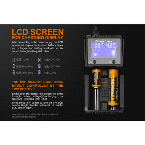 Never run out of power with the new Fenix ARE-A2 dual-channel battery charger. This upgraded battery charger can effortlessly charge 10440, 14500, 16340, 18650, 21700 and 26650 batteries. The Fenix ARE-A2 has a multiple protection design that includes short-circuit protection, over-current protection, over-voltage protection, and reverse polarity protection. Easily view battery details on the bright LCD battery charger display. Single clicks will cycle through the voltage, charging current, and charging time details. A long press on the button will turn off the LCD screen. Charge batteries on the go with the DC 12-24V car adapter (sold separately).