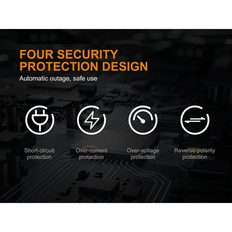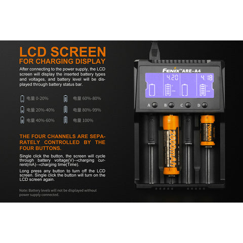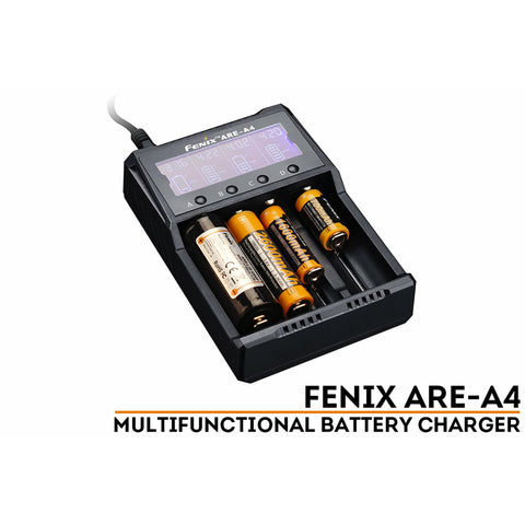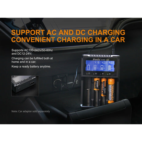 Charge up to 4 batteries at the same time with the new Fenix ARE-A4 Battery Charger. This amazing 4-channel battery charger is compatible with a multitude of batteries including 14500, 16340 and 18650 batteries plus Ni-MH and Ni-Cd AA, AAA, and C batteries. The all-new ARE-A4 charger provides 4 layers of security for safe use including short-circuit, over-current, over-voltage, and reverse polarity protection. View the most current battery charging setting on the ultra bright LCD screen. Single clicks on the charger button cycle through charging specs including battery voltage, charging current, and charging time. A long press or click will turn off the LCD screen. The Fenix ARE-A4 is compatible with both AC and DC charging so you can charge batteries at home or on the go in the car. The DC charging adapter cable is sold separately.