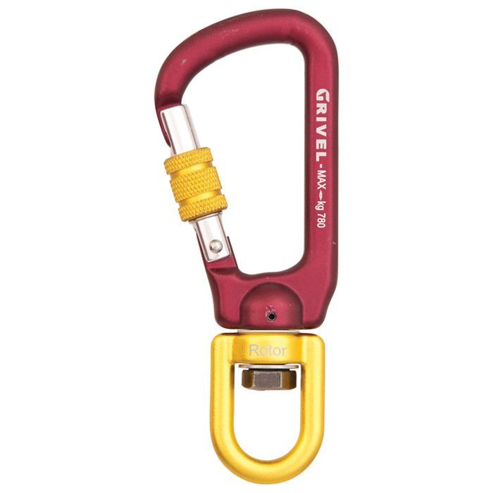 Small carabiner with swivel attachment for minimizing rope tangles. Rotor has a maximum resistance of 600kg and must never be used instead of a normal carabiner when climbing or belaying. Patented.