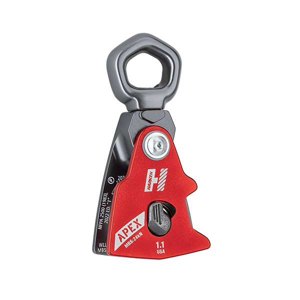 This smaller sized Apex Swivel Pulley offers both easy one-handed operation and unmatched security. The Apex is a mid-line attachable pulley that secures the rope using a low-profile, patented, triple-action lock mechanism. This lock is operated by three distinct actions: pivot the lock button, depress it, then swing open the side plate. Simply closing the side-plate re-engages the lock mechanism and solidly secures the rope. The operation is intuitive and ergonomic. The Apex features symmetrical side-plates which are optimized for integration with prusik-based progress capture systems. This streamlines system set-up and minimizes the possibility of mis-rigging. The swivel eye on the 1.1" was designed to accommodate a single carabiner. It is also soft-goods-compatible for situations where you want to eliminate the carabiner. The U.S. made Apex Pulley line represents the new standard for rescue, rope access, or arborism.