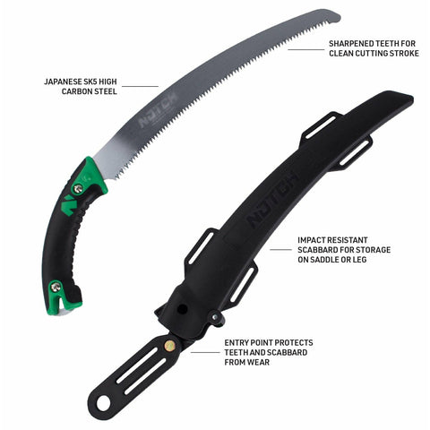 This ultimate cutting tool from Notch Equipment features solid cutting power and a comfortable grip you can use all day long. Each razor sharp blade is made from high carbon, Japanese SK5 steel, and features a full tang blade (which means blade extends all the way through the handle). It’s the full tang that gives the Notch Legacy handsaws the cutting power and balance tree workers need. Blade is terminated with bullnose which prevents damage to the scabbard during saw insertion and removal. The teeth on the blades are tri- edge and impulse hardened to maintain maximum sharpness. Bringing it all together is our 2-shot injection molded handle that feels like it was made just for your hand. The comfortable rubber grip and ergonomic curvature will have you reaching for this saw every time. Each saw ships with a positive locking scabbard designed to keep your saw secure and prevent it from falling out during the most difficult climbs